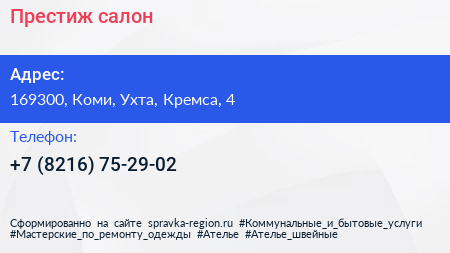 Престиж, салон по адресу 169300, Коми, Ухта, Кремса, 4 в дальнейшем Организация, размещена в следующих категориях: