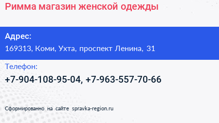 Римма, магазин женской одежды по адресу 169313, Коми, Ухта, проспект Ленина, 31 в дальнейшем Организация, размещена в следующих категориях: