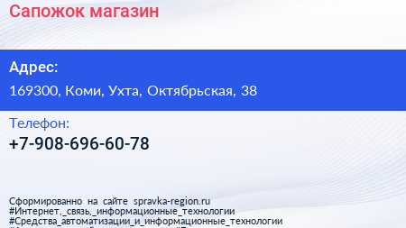 Сапожок, магазин по адресу 169300, Коми, Ухта, Октябрьская, 38 в дальнейшем Организация, размещена в следующих категориях: