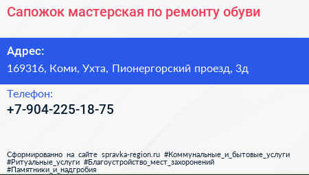 Сапожок, мастерская по ремонту обуви по адресу 169316, Коми, Ухта, Пионергорский проезд, 3д в дальнейшем Организация, размещена в следующих категориях: