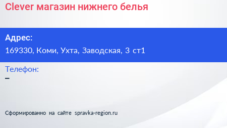 Сlever, магазин нижнего белья по адресу 169330, Коми, Ухта, Заводская, 3 ст1 в дальнейшем Организация, размещена в следующих категориях: