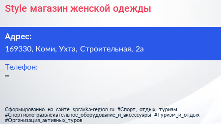 Style, магазин женской одежды по адресу 169330, Коми, Ухта, Строительная, 2а в дальнейшем Организация, размещена в следующих категориях: