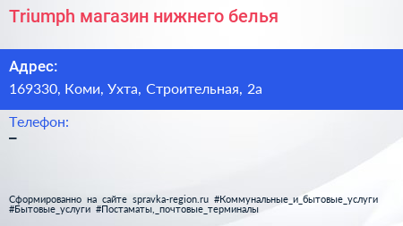 Triumph, магазин нижнего белья по адресу 169330, Коми, Ухта, Строительная, 2а в дальнейшем Организация, размещена в следующих категориях: