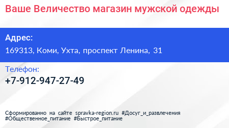 Ваше Величество, магазин мужской одежды по адресу 169313, Коми, Ухта, проспект Ленина, 31 в дальнейшем Организация, размещена в следующих категориях:
