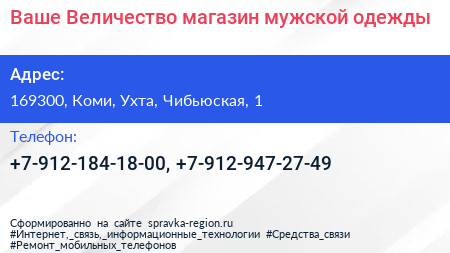 Ваше Величество, магазин мужской одежды по адресу 169300, Коми, Ухта, Чибьюская, 1 в дальнейшем Организация, размещена в следующих категориях: