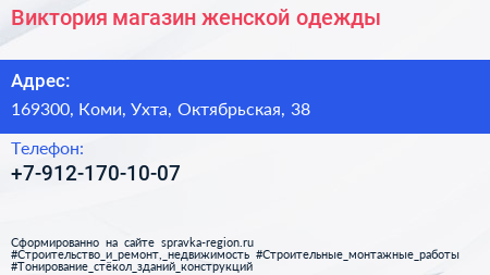 Виктория, магазин женской одежды по адресу 169300, Коми, Ухта, Октябрьская, 38 в дальнейшем Организация, размещена в следующих категориях: