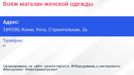Вояж, магазин женской одежды по адресу 169330, Коми, Ухта, Строительная, 2а в дальнейшем Организация, размещена в следующих категориях: