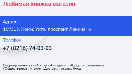 Любимая книжка, магазин по адресу 169313, Коми, Ухта, проспект Ленина, 6 в дальнейшем Организация, размещена в следующих категориях: