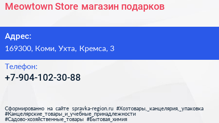 Meowtown Store, магазин подарков по адресу 169300, Коми, Ухта, Кремса, 3 в дальнейшем Организация, размещена в следующих категориях: