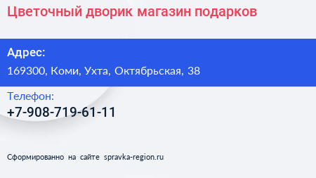 Цветочный дворик, магазин подарков по адресу 169300, Коми, Ухта, Октябрьская, 38 в дальнейшем Организация, размещена в следующих категориях:
