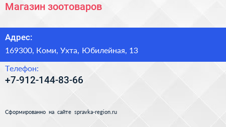 Магазин зоотоваров по адресу 169300, Коми, Ухта, Юбилейная, 13 в дальнейшем Организация, размещена в следующих категориях:
