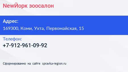 NewЙорк, зоосалон по адресу 169300, Коми, Ухта, Первомайская, 15 в дальнейшем Организация, размещена в следующих категориях: