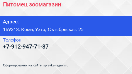 Питомец, зоомагазин по адресу 169313, Коми, Ухта, Октябрьская, 25 в дальнейшем Организация, размещена в следующих категориях: