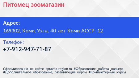 Питомец, зоомагазин по адресу 169302, Коми, Ухта, 40 лет Коми АССР, 12 в дальнейшем Организация, размещена в следующих категориях: