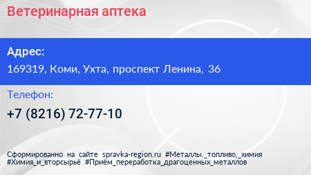 Ветеринарная аптека по адресу 169319, Коми, Ухта, проспект Ленина, 36 в дальнейшем Организация, размещена в следующих категориях: