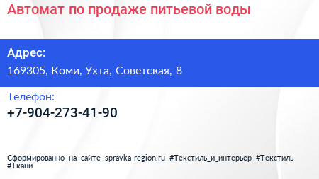Автомат по продаже питьевой воды по адресу 169305, Коми, Ухта, Советская, 8 в дальнейшем Организация, размещена в следующих категориях: