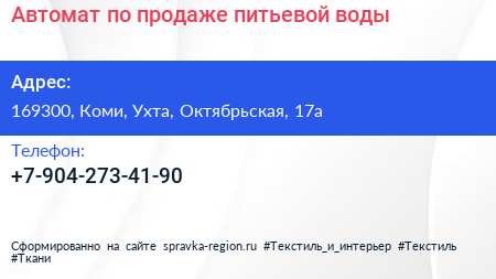 Автомат по продаже питьевой воды по адресу 169300, Коми, Ухта, Октябрьская, 17а в дальнейшем Организация, размещена в следующих категориях: