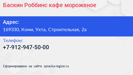 Баскин Роббинс, кафе-мороженое по адресу 169330, Коми, Ухта, Строительная, 2а в дальнейшем Организация, размещена в следующих категориях: