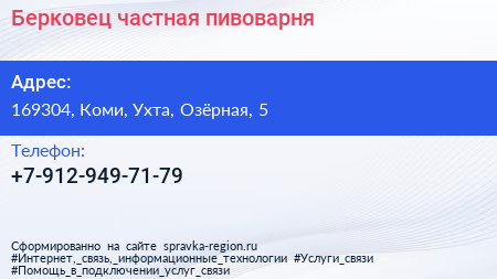 Берковец, частная пивоварня по адресу 169304, Коми, Ухта, Озёрная, 5 в дальнейшем Организация, размещена в следующих категориях: