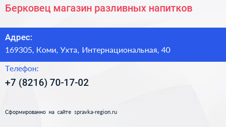 Берковец, магазин разливных напитков по адресу 169305, Коми, Ухта, Интернациональная, 40 в дальнейшем Организация, размещена в следующих категориях:
