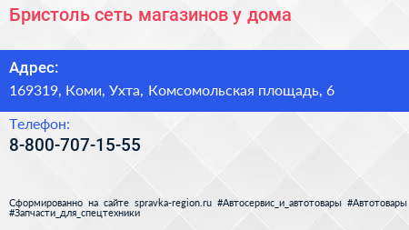 Бристоль, сеть магазинов у дома по адресу 169319, Коми, Ухта, Комсомольская площадь, 6 в дальнейшем Организация, размещена в следующих категориях: