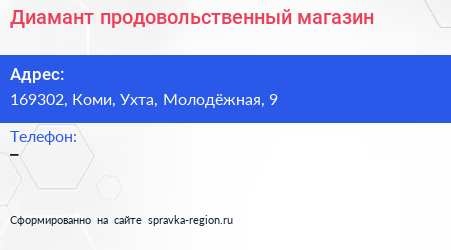 Диамант, продовольственный магазин по адресу 169302, Коми, Ухта, Молодёжная, 9 в дальнейшем Организация, размещена в следующих категориях: