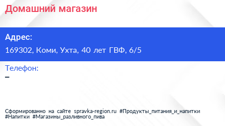 Домашний, магазин по адресу 169302, Коми, Ухта, 40 лет ГВФ, 6/5 в дальнейшем Организация, размещена в следующих категориях: