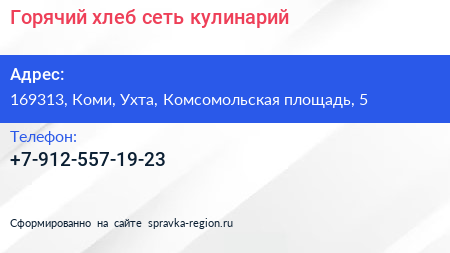 Горячий хлеб, сеть кулинарий по адресу 169313, Коми, Ухта, Комсомольская площадь, 5 в дальнейшем Организация, размещена в следующих категориях: