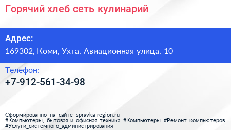 Горячий хлеб, сеть кулинарий по адресу 169302, Коми, Ухта, Авиационная улица, 10 в дальнейшем Организация, размещена в следующих категориях: