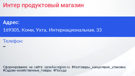 Интер, продуктовый магазин по адресу 169305, Коми, Ухта, Интернациональная, 33 в дальнейшем Организация, размещена в следующих категориях: