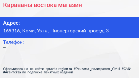 Караваны востока, магазин по адресу 169316, Коми, Ухта, Пионергорский проезд, 3 в дальнейшем Организация, размещена в следующих категориях: