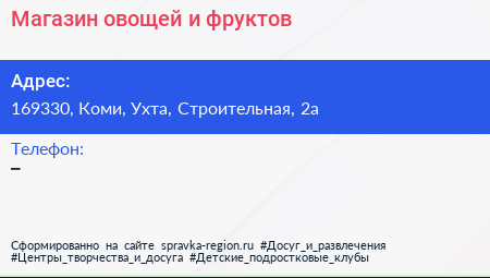 Магазин овощей и фруктов по адресу 169330, Коми, Ухта, Строительная, 2а в дальнейшем Организация, размещена в следующих категориях: