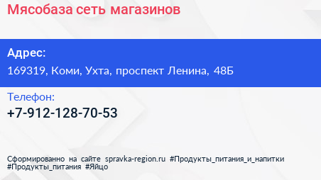 Мясобаза, сеть магазинов по адресу 169319, Коми, Ухта, проспект Ленина, 48Б в дальнейшем Организация, размещена в следующих категориях: