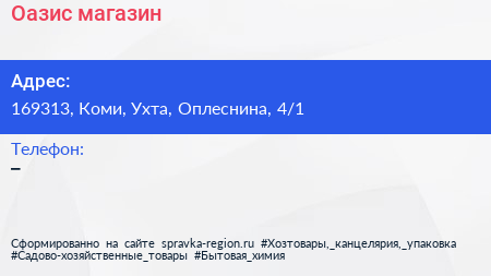 Оазис, магазин по адресу 169313, Коми, Ухта, Оплеснина, 4/1 в дальнейшем Организация, размещена в следующих категориях: