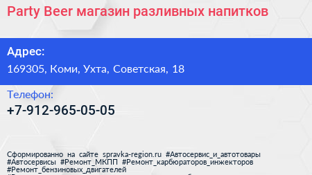 Party Beer, магазин разливных напитков по адресу 169305, Коми, Ухта, Советская, 18 в дальнейшем Организация, размещена в следующих категориях: