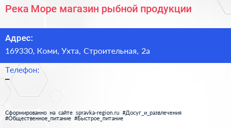 Река Море, магазин рыбной продукции по адресу 169330, Коми, Ухта, Строительная, 2а в дальнейшем Организация, размещена в следующих категориях: