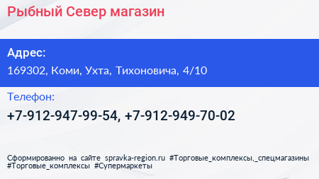 Рыбный Север, магазин по адресу 169302, Коми, Ухта, Тихоновича, 4/10 в дальнейшем Организация, размещена в следующих категориях: