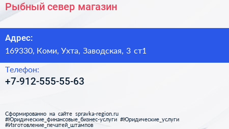 Рыбный север, магазин по адресу 169330, Коми, Ухта, Заводская, 3 ст1 в дальнейшем Организация, размещена в следующих категориях: