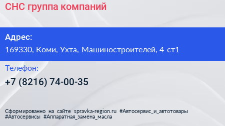 СНС, группа компаний по адресу 169330, Коми, Ухта, Машиностроителей, 4 ст1 в дальнейшем Организация, размещена в следующих категориях: