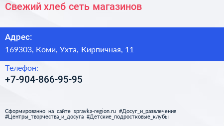 Свежий хлеб, сеть магазинов по адресу 169303, Коми, Ухта, Кирпичная, 11 в дальнейшем Организация, размещена в следующих категориях: