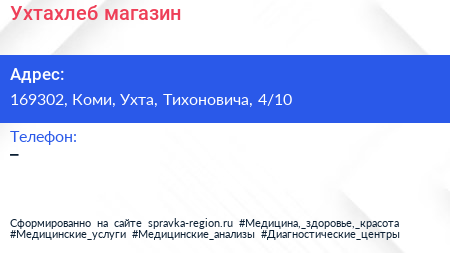 Ухтахлеб, магазин по адресу 169302, Коми, Ухта, Тихоновича, 4/10 в дальнейшем Организация, размещена в следующих категориях: