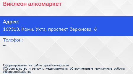 Виклеон, алкомаркет по адресу 169313, Коми, Ухта, проспект Зерюнова, 6 в дальнейшем Организация, размещена в следующих категориях: