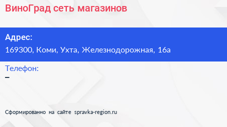 ВиноГрад, сеть магазинов по адресу 169300, Коми, Ухта, Железнодорожная, 16а в дальнейшем Организация, размещена в следующих категориях: