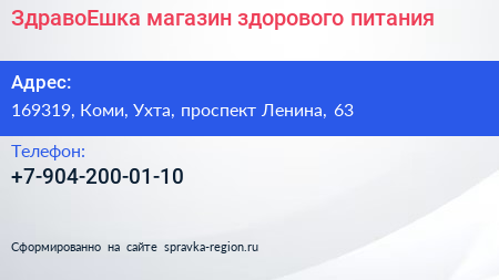 ЗдравоЕшка, магазин здорового питания по адресу 169319, Коми, Ухта, проспект Ленина, 63 в дальнейшем Организация, размещена в следующих категориях: