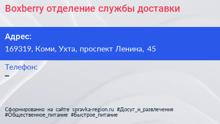 Boxberry, отделение службы доставки по адресу 169319, Коми, Ухта, проспект Ленина, 45 в дальнейшем Организация, размещена в следующих категориях: