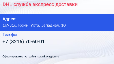 DHL, служба экспресс-доставки по адресу 169316, Коми, Ухта, Западная, 10 в дальнейшем Организация, размещена в следующих категориях: