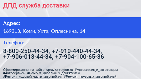 ДПД, служба доставки по адресу 169313, Коми, Ухта, Оплеснина, 14 в дальнейшем Организация, размещена в следующих категориях: