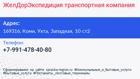 ЖелДорЭкспедиция, транспортная компания по адресу 169316, Коми, Ухта, Западная, 10 ст2 в дальнейшем Организация, размещена в следующих категориях: