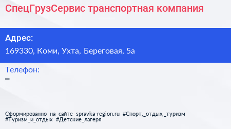 СпецГрузСервис, транспортная компания по адресу 169330, Коми, Ухта, Береговая, 5а в дальнейшем Организация, размещена в следующих категориях:
