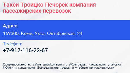 Такси Троицко-Печорск, компания пассажирских перевозок по адресу 169300, Коми, Ухта, Октябрьская, 24 в дальнейшем Организация, размещена в следующих категориях: